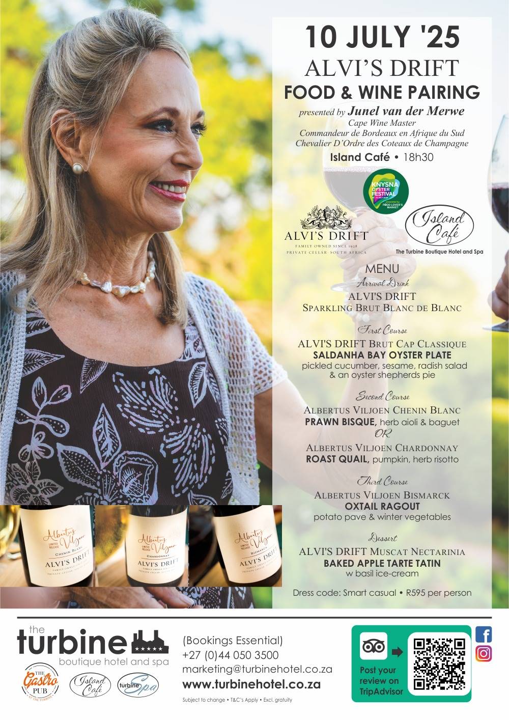 If you needed an excuse to trade Table Mountain views for lagoon sunsets, here it is: Alvi’s Drift Food & Wine Pairing Evening is happening on 10 July 2025 at the stylish Island Café in the Turbine Boutique Hotel & Spa, and it’s shaping up to be a must-do event of the Knysna Oyster Festival.