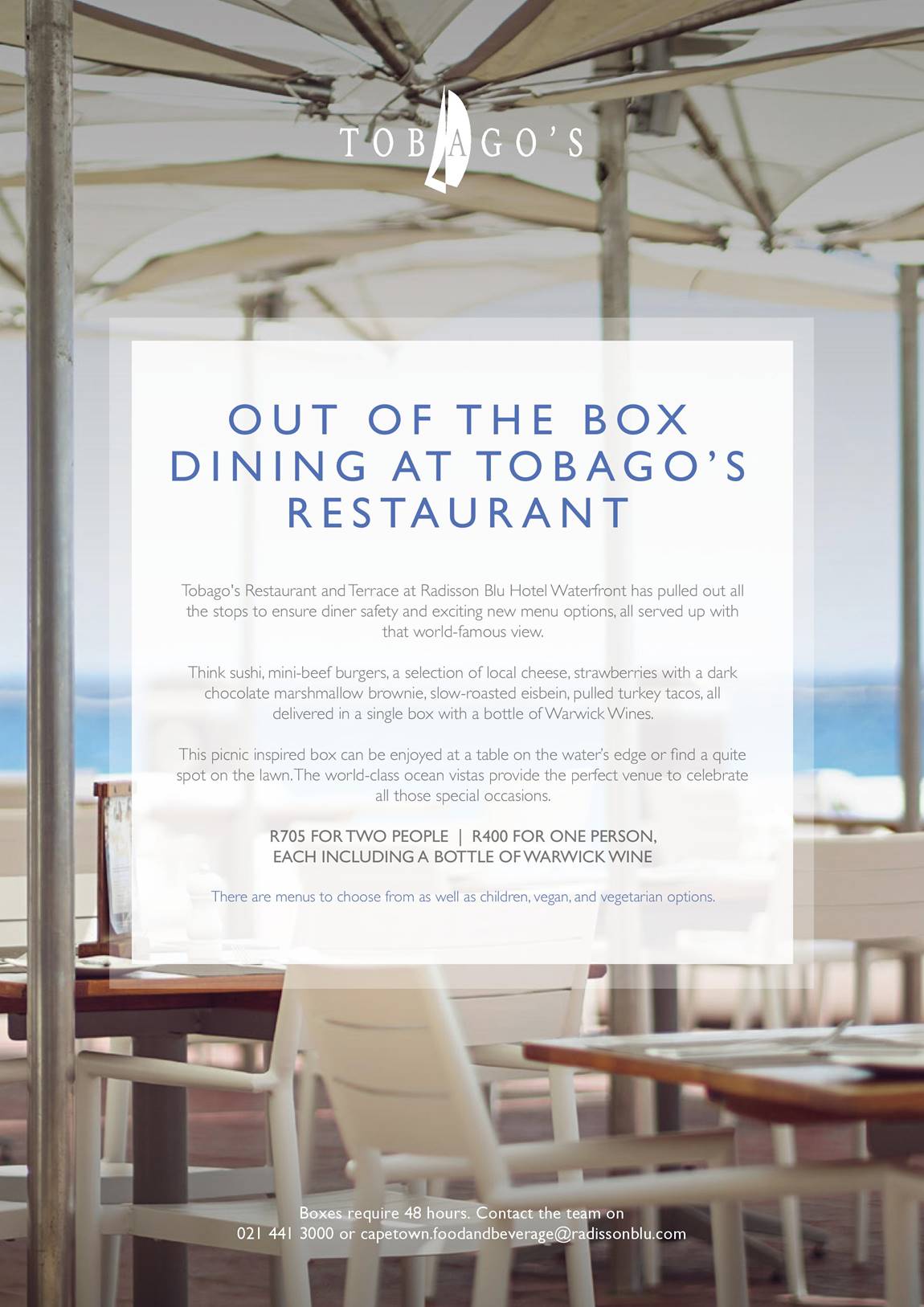 Children, vegan and vegetarian baskets available on request. The new dining boxes, which can be enjoyed picnic-style on the terrace, are the perfect way to celebrate spring in Cape Town. The boxes can be booked and paid for in advance (at least 48 hours’ notice is required), allowing for less interaction since all your food is delivered at once, limiting further dealings with your server.