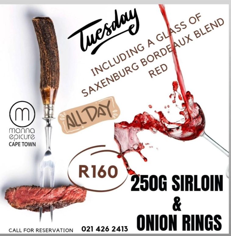 Located in the heart of Cape Town, Manna Epicure is renowned for its high-quality ingredients, relaxed yet stylish setting, and exceptional service. This Tuesday special is a great way to experience one of the city’s favourite dining spots without breaking the bank. Bookings are essential, so call 021 426 2413 to reserve your table and make the most of this fantastic offer.