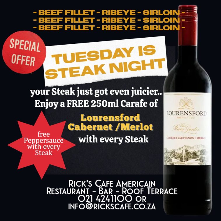 Summer is in full swing, and if your idea of a good time involves steak, wine, and roof top views, then Rick’s Café Américain in Cape Town has your Tuesday night sorted.