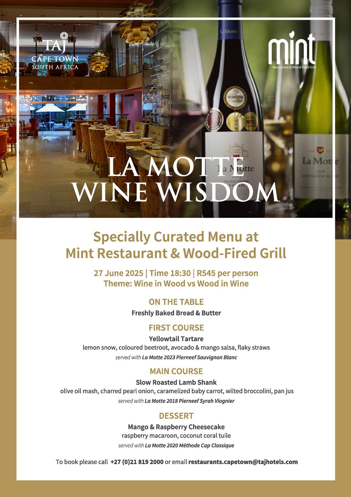 On Friday, 27 June 2025, Mint Restaurant & Wood-Fired Grill at the Taj Cape Town is uncorking an evening that’s equal parts flavour, fire, and finesse with a signature experience: the Wine Wisdom Dinner, in collaboration with the iconic La Motte Wines.