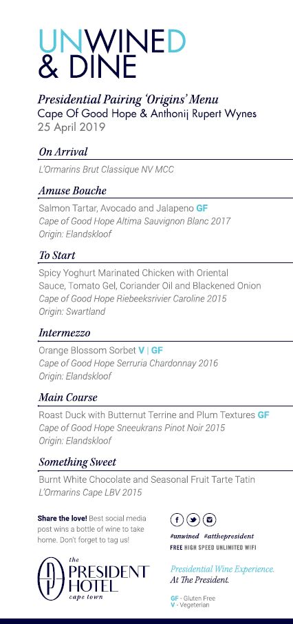 Their executive chef invites food and wine lovers alike to indulge in a culinary experience with a five-course dinner expertly paired with Anthonij Rupert Wines on 25 April from 7pm. Enjoy a glass of the L’Ormarins Brut Classique NV MCC upon arrival and courses such as salmon tartare, yoghurt marinated chicken, roast duck and white chocolate tarte tatin. Come and awaken your senses all for R450 per person.