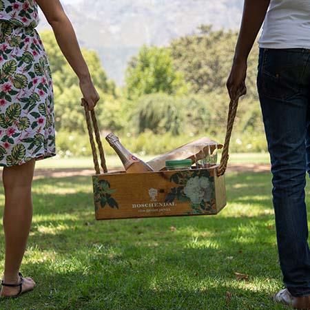 Enjoy an extra special selection of produce and homemade treats like chocolate truffles, white chocolate cheesecake, strawberries and Boschendal Brut Rose all neatly packaged in a picnic basket for two.
