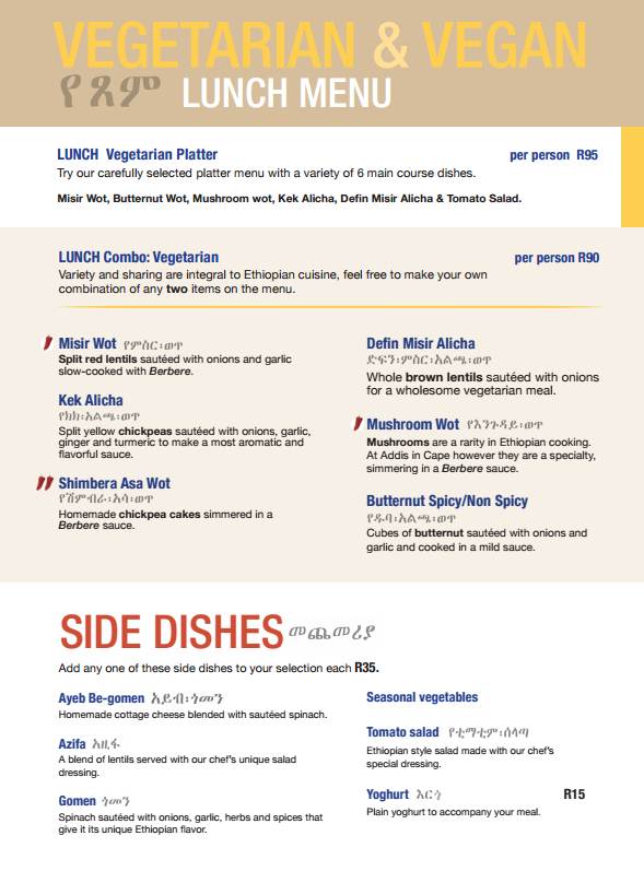 During lunch hours, Addis is offering a fantastic Vegetariant & Vegan menu where their platter (R95) showcases their six most popular lunch dishes while a combo meal (R90) is also available, where you are able to choose any two items from the lunch menu as shown below.