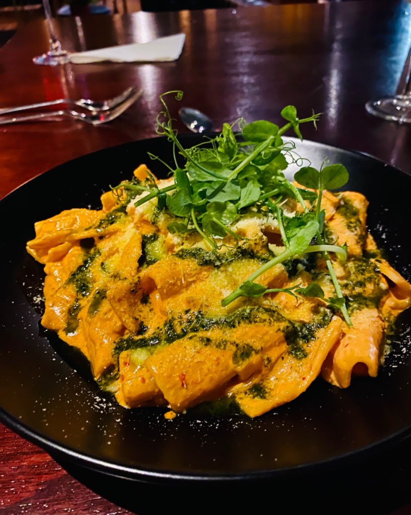 Al dente pasta bathed in a velvety tomato sauce spiked with red wine. A little heavy on the chilli unfortunately which overpowered the flavour balance. A generous dusting of Parmesan and a drizzle of herbaceous basil oil elevate every bite. Paired with the Plaisir Estate Red, the match is bold and harmonious—the wine’s dark cherry and spice notes echoing the dish’s depth while cooling the heat.