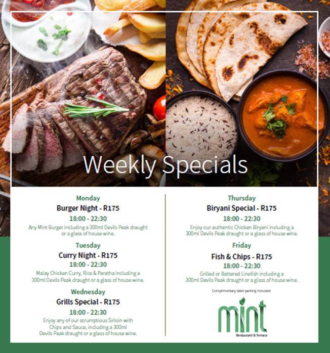 With it’s warm and welcoming atmosphere, Mint is the perfect place to relax and unwind with family and friends; and now you can do just that with their weekly, week-night specials! T hey are offering a range of specials, one for every night of the work week!
