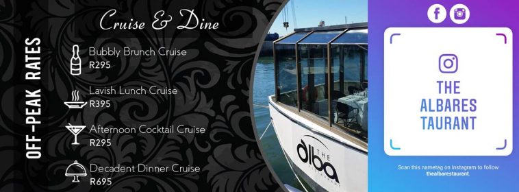 All cruises are available Monday to Sunday. To find out more information on any of these cruises and specials, visit www.thealba.co.za