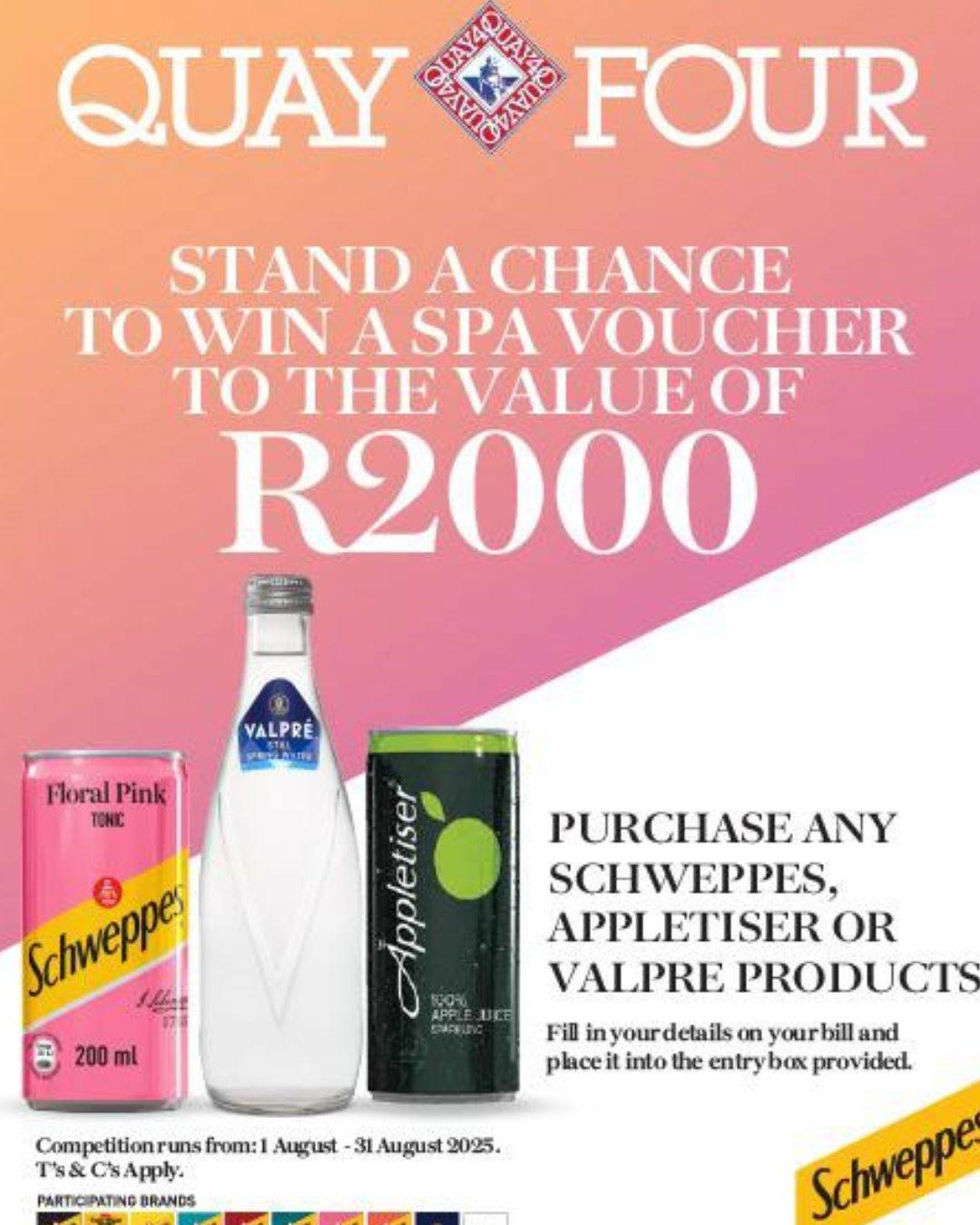 Order any Schweppes, Appletiser, or Valpré product—think Floral Pink Tonic, sparkling Appletiser, or a crisp Valpré on a warm day.