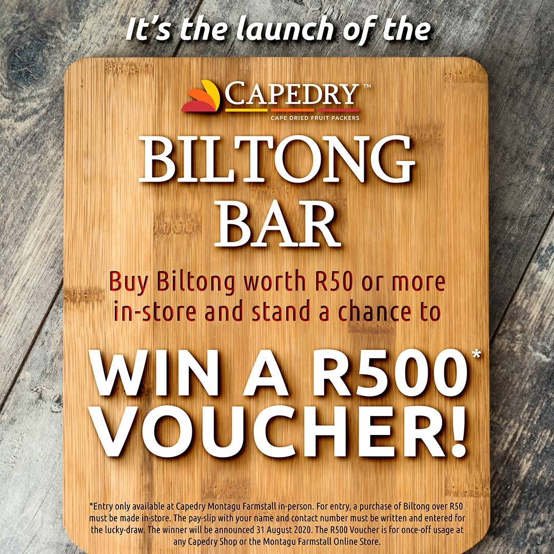 That’s a flavour combo we’d like to try. Visit the Capedry shop in Montagu and purchase delicious biltong from their new biltong bar and stand a chance to win a Capedry voucher worth R500!