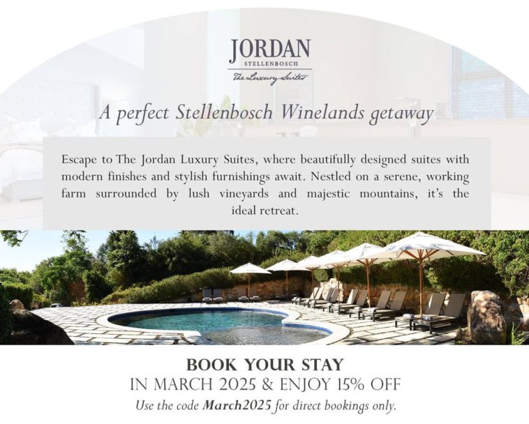 - Imagine waking up to the gentle hum of a working wine farm, the scent of fresh mountain air wafting through your window, and the knowledge that the hardest decision of your day will be whether to order another glass of Chardonnay or switch to a bold Cabernet. That’s the kind of bliss waiting at The Jordan Luxury Suites, where guests can enjoy 15% off their stay in March 2025—all you need to do is use the code March2025 for direct bookings.