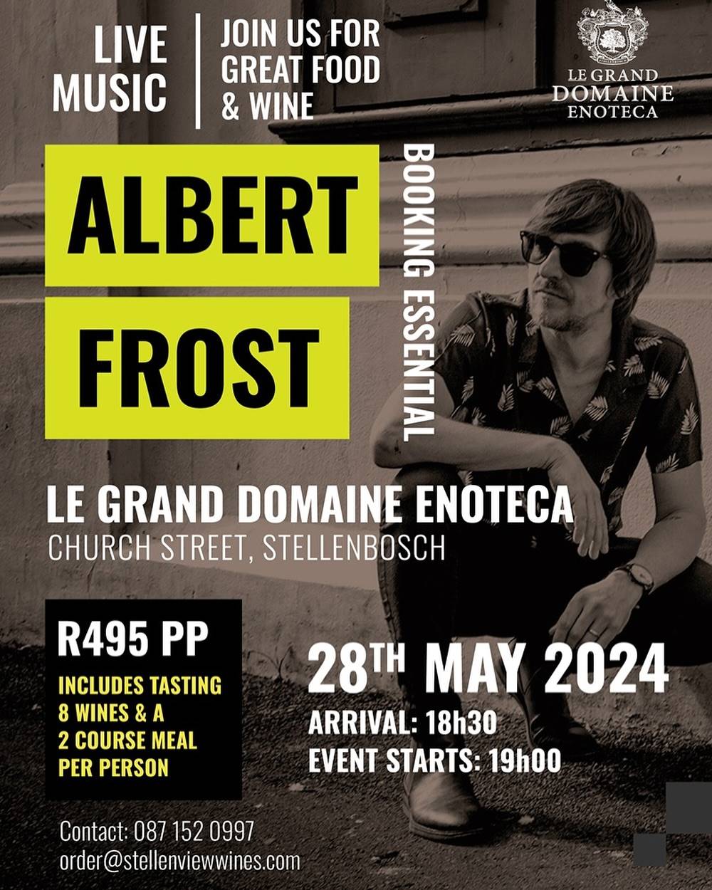 - Paired with a delectable two-course meal, each sip will be elevated by the harmonious melodies of legendary musician Albert Frost all available for R495 pp. The ambiance is set with complimentary sparkling wine upon arrival and a special gift bottle of wine to take home, valued at R280. Guests will also enjoy a generous wine tasting throughout the evening.
