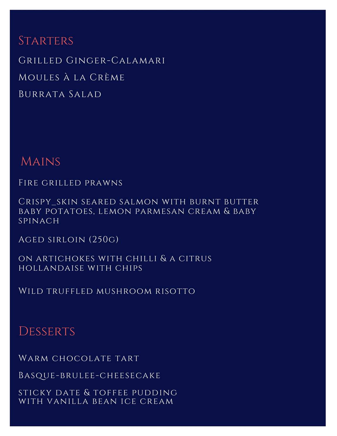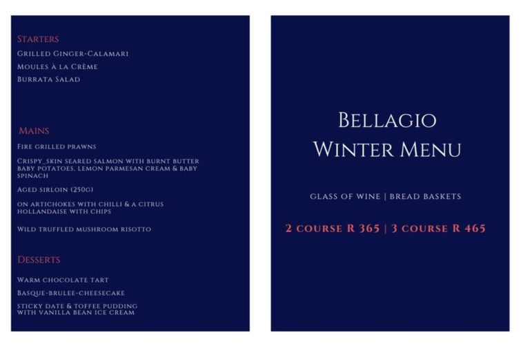 Bellagio’s Winter Set Menu features two enticing options: a 2-course meal for R365 and a 3-course meal for R465.