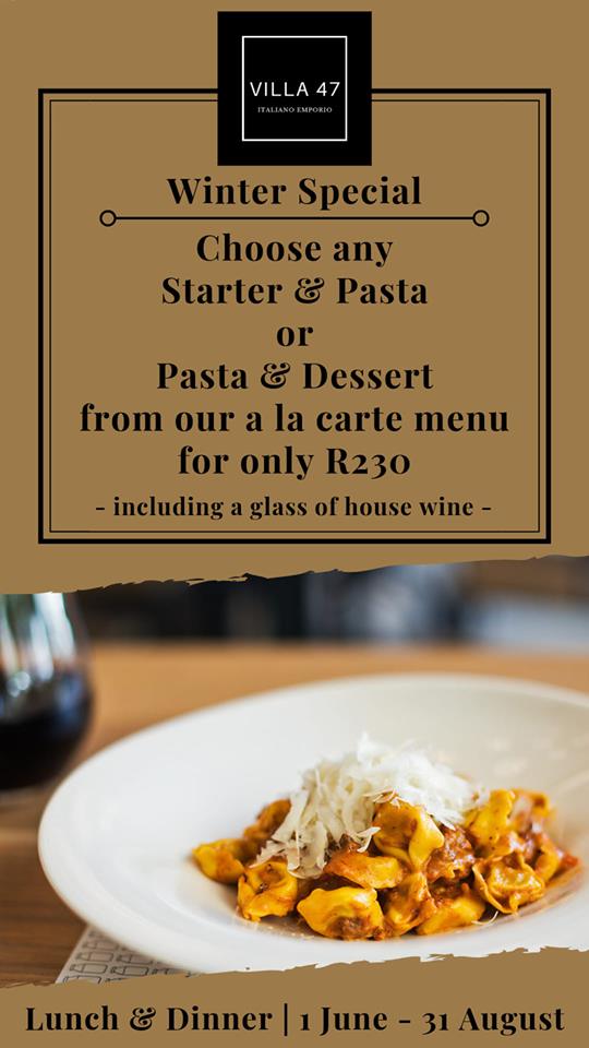It’s winter comfort food Italian style with their winter special . Choose any starter and pasta or pasta and dessert and a glass of house wine for only R320. It’s bound to warm you up just right! Items to be chosen from their a la carte menu.